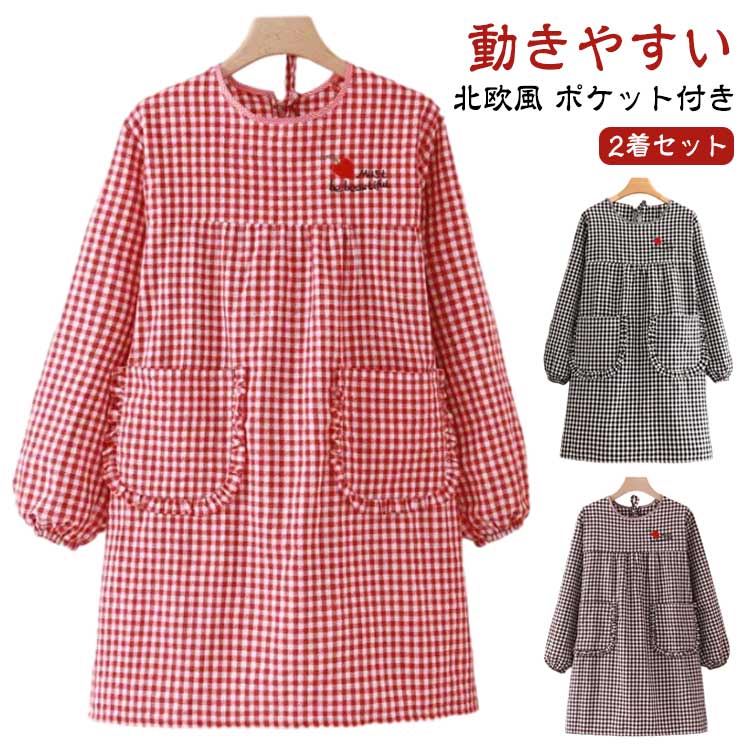 かっぽうぎ エプロン 2着セット 袖付き長袖 ロング丈 オシャレ 可愛い 料理 家事 プレゼント 綿 おしゃれ レディース かわいい カフェ 北欧風 ポケット付き 大きいサイズ