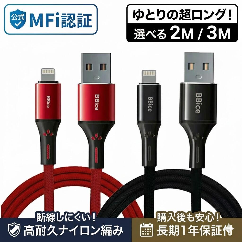 iPhone 充電ケーブル ライトニングケーブル 2m 3m 長い 高耐久 ナイロン編み 断線しにくい 急速充電 データ転送 Lightning Apple認証品 1年保証付き iPhon ケーブル