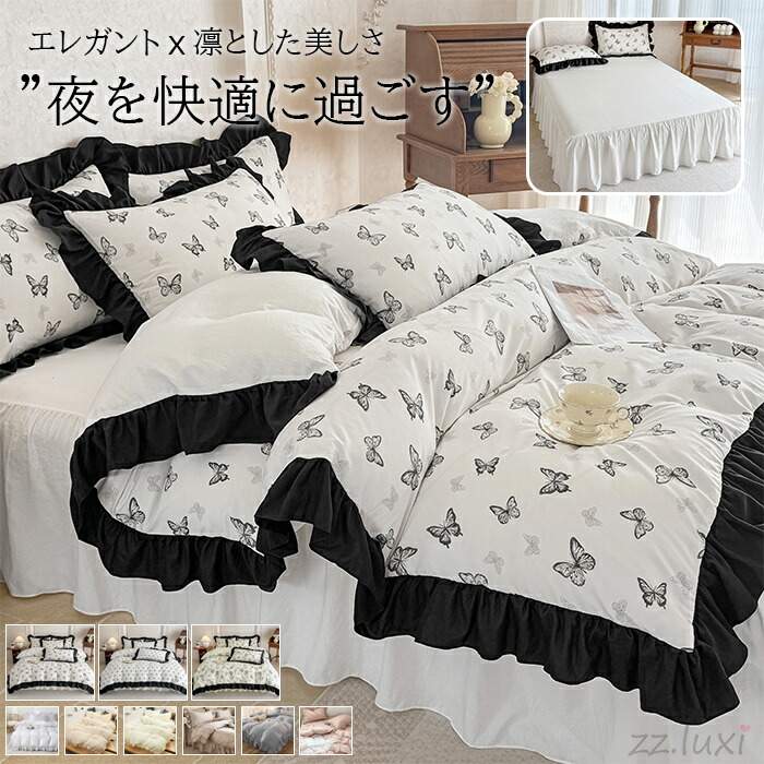 お洒落なフリル付き布団カバーセット 蝶柄 花柄 リボン柄 無地 ベッドスカート シングル 3点セット セミダブル 4点セット 枕カバー 寝具 布団カバー