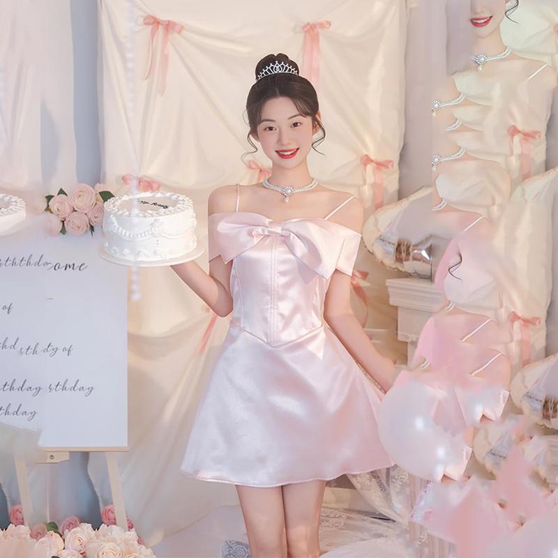 春 コーデ レディース ファッション オシャレ カワイイ シンプル きれいめ ナチュラル 上品カジュアル 婦人服 ピンク リボン プリンセス ウエスト ライン ドレス