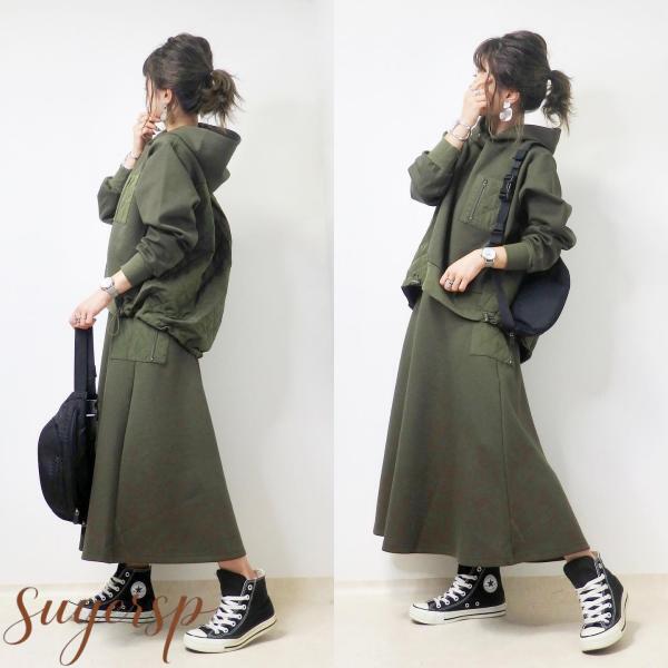 2点セット レディース 秋冬 パーカー 切り替え 長袖 スカート スカートセット セットアップ ウエストゴム ライン ロングスカート ロング丈 無地 ゆったり 着痩せ おしゃれ 可愛い 体型カバー