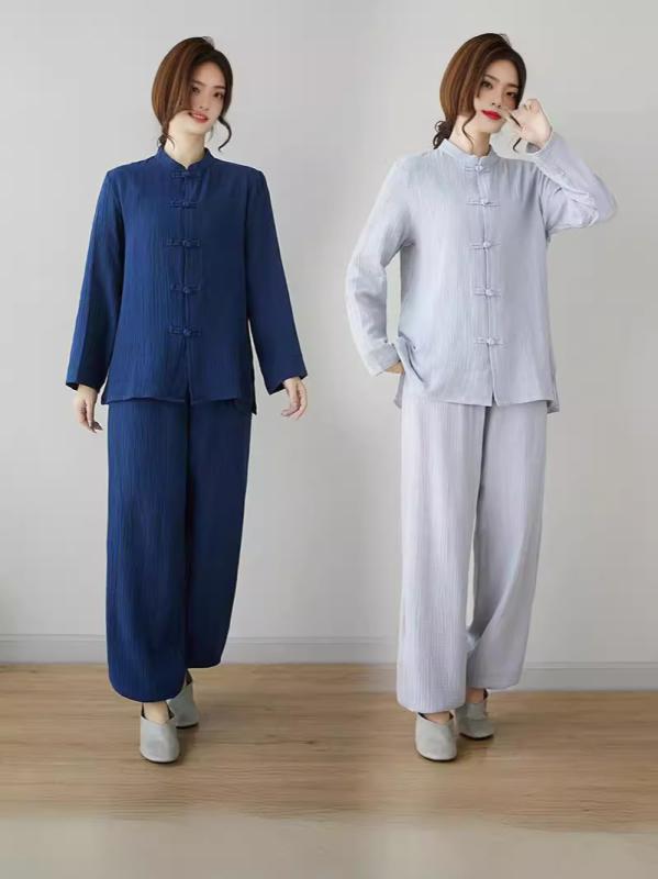 作務衣 中国風 チャイナボタン レトロ 切り替え 綿麻 コットンリネン 再生繊維 禅服 茶服 居士服 太極拳ウェア 練習着 トレーニングウェア ルームウェア 上下セット ライトグレー ラ セットアップ
