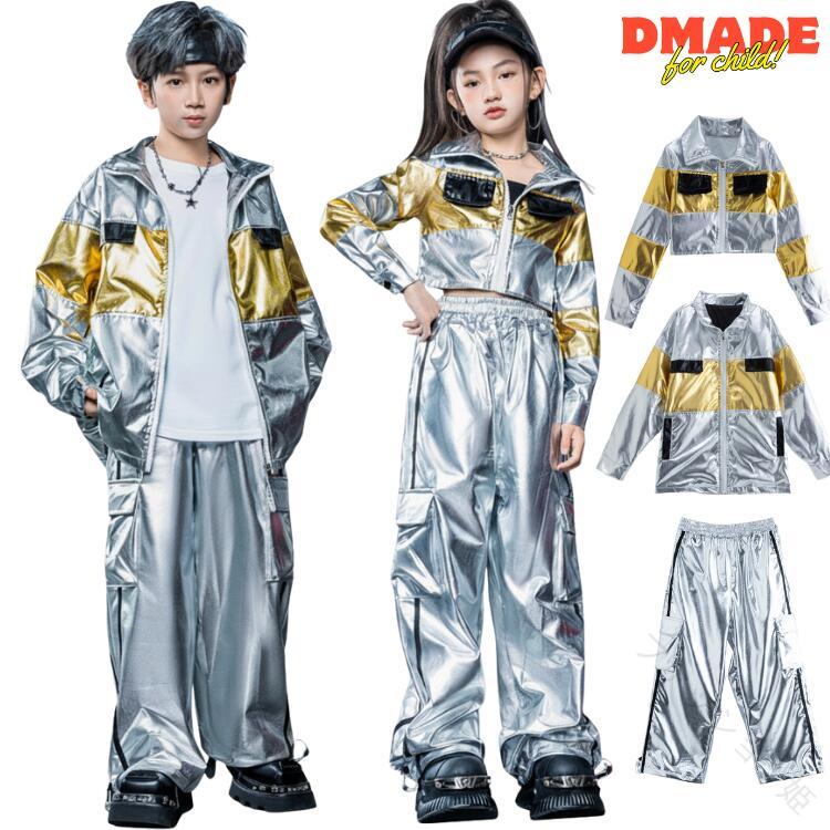 メタリック 衣装 キッズ ダンス セットアップ シルバー ゴールド ジャケット パンツ HIPHOP ダンス衣装 kpop 韓国 子供用 ヒップホップ 派手 発表会 ダンス発表会 へそ出 ステージ衣装