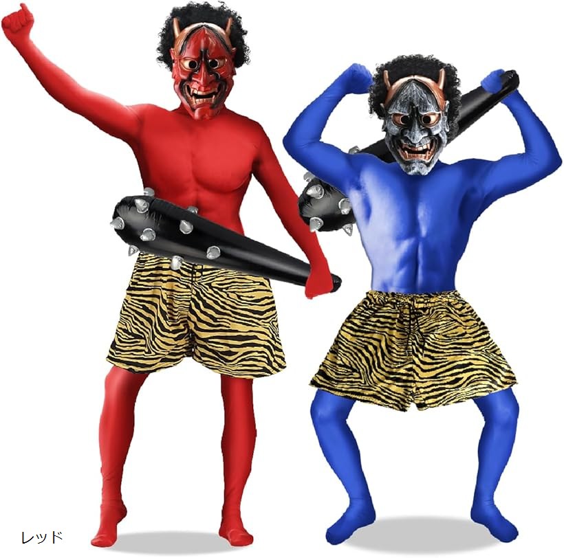 肌見えゼロ 節分用衣装 鬼コスチューム 5点フルセット 全身タイツ ウィッグ付き 棍棒 虎柄パンツ お面