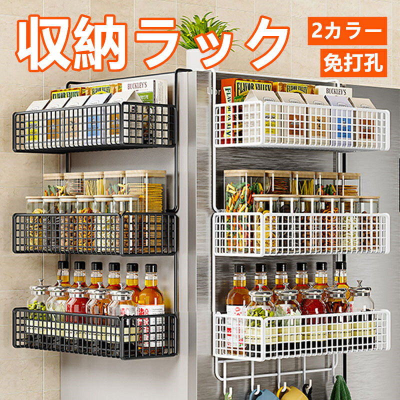 免打孔 キッチンシェルフ 冷蔵庫サイドシェルフ 吊り下げ式 スパイスラック 収納ラック 食器棚サイド 収納 壁掛け式 2段 3段 ブラック ホワイト スパイス収納 収納シェルフ 簡単設置 洗濯 多機能