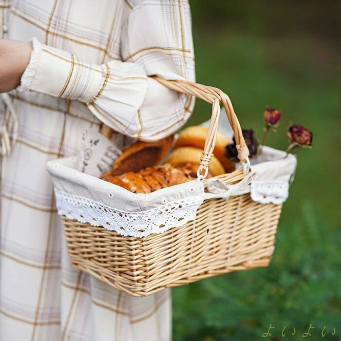 ピクニックバスケット かごバスケット かごバッグ レース内布付き ハンドル付き ピクニック バスケット 持ち手 カゴ 籠バッグ 収納 おもちゃ 小物入れ おしゃれ 編み 柳バスケット 天然 インテリア