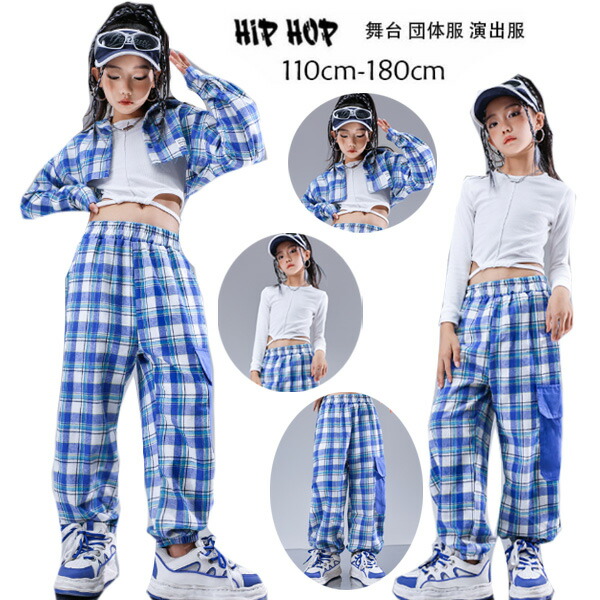 ダンスパンツ ブルー チェック柄パンツ 女の子 ドラム演出服 jazz 演出服 原宿系 キッズ ダンス衣装 hiphop K-pop 舞台 団体服 ワイドパンツ 白Tシャツ 子供ダンス ダ 長袖シャツ