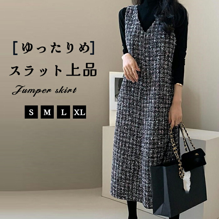 ジャンパースカート レディース フォーマル 大人 黒 ロング セレモニー サロペット スカート vネック チェック マキシ丈 オールインワン ワンピース 春 秋 冬 綿 ノースリーブ きれいめ ウール