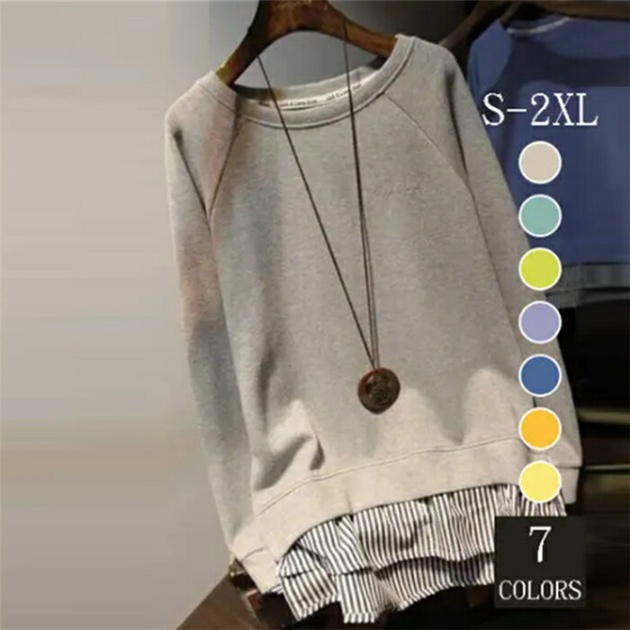 レイヤード トレーナー プルオーバー ラウンドネック スウェット 長袖 無地 レイヤードインナー 配色 切り替え 大きいサイズ レディース シンプル ストライプ柄