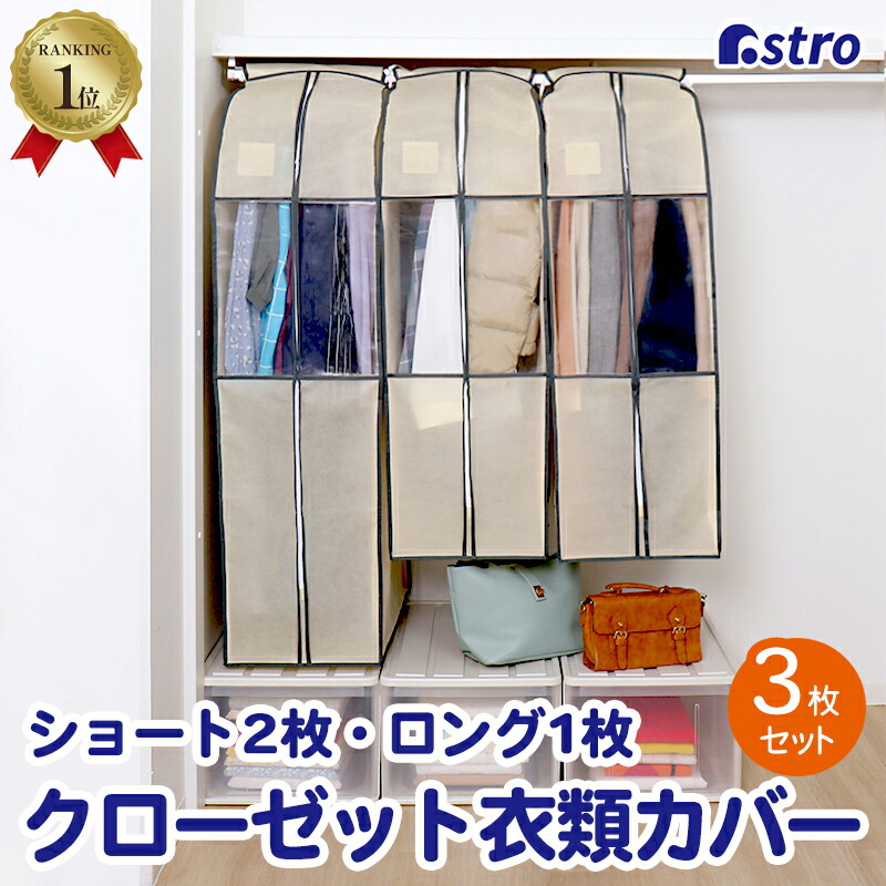 マチ付き 衣類カバー ベージュ まとめて収納 3枚組 スーツ2枚 ロング1枚 防虫ポケット付 クローゼット収納 ハンガー 不織布 ホコリよけ 洋服カバー 衣装カバー ジャケット コスプレ 衣装 スーツ