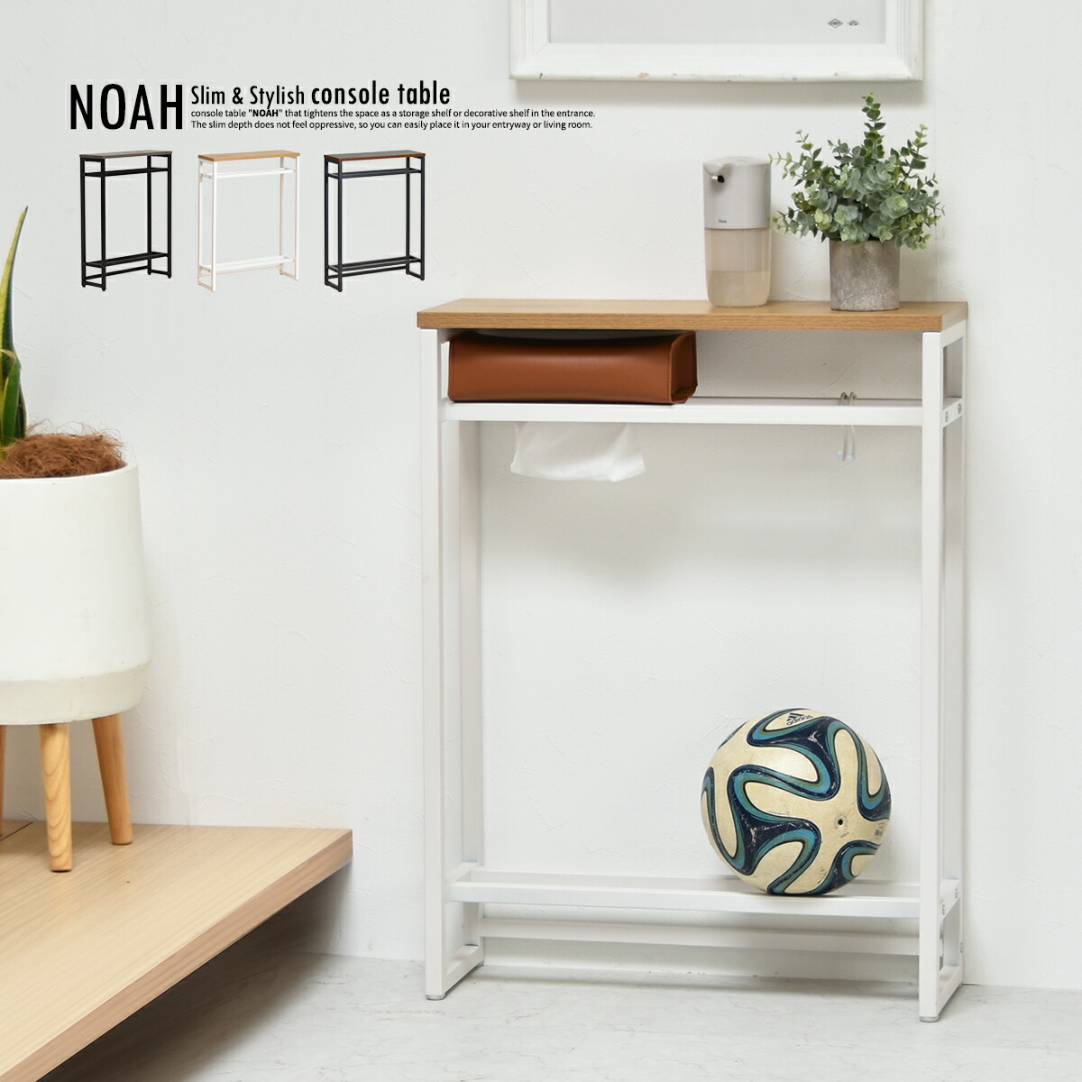 スリムコンソールテーブル ノア スリムコンパクト コンソールデスク 飾り棚 ナチュラル木目×ホワイトアイアン ブラウン木目×ブラックアイアン 玄関テーブル ボール収納