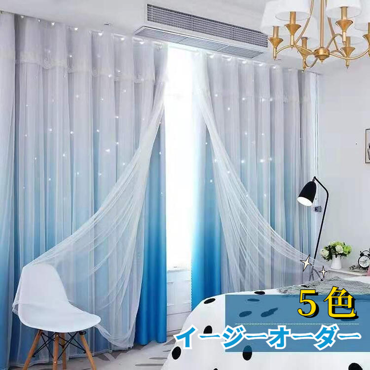 カーテン 星 透かし グラデーション オーダーカーテン 上飾り レースカーテン付き 2重 ダブル おしゃれ 西海岸風 モダン 星穴 彫り透かし 女の子 男の子 子供部屋 姫系 寝室 居間 店 リビング