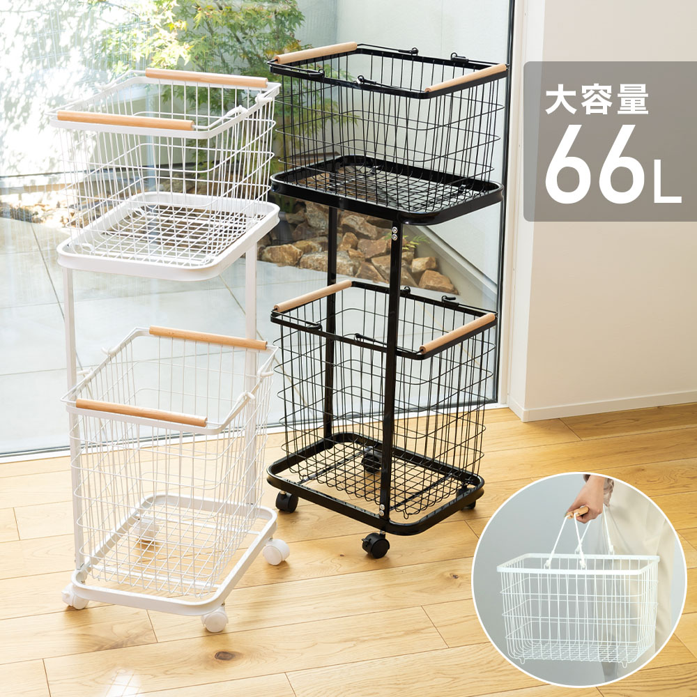 ランドリーバスケット 2段 キャスター付き 2個セット スリム 大容量 ランドリーワゴン 洗濯カゴ バスケット スクエアタイプ ハンドル 持ち手付き ワイヤー ワゴン 洗濯かご 脱衣かご かご 収納