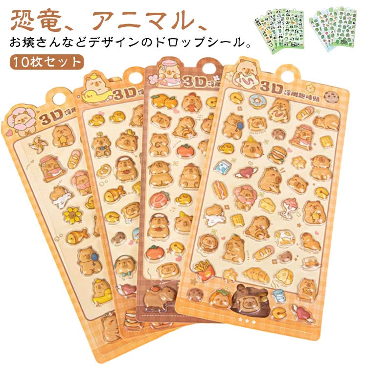 10枚セット お嬢さん ドロップシール 3Dシール 動物 女の子 シール キャラクター ステッカー アニマル 恐竜 スマホケース デコ アルバム 手帳 かわいい ボンドロッ シールシート