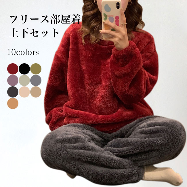 部屋着 冬 フリース レディース ルームウェア 上下セット モコモコ 厚手 パジャマ シンプル フリースパジャマ 20代 30代 40代 50代 ボアパジャマ 女性 上下2点セット あったか 冷 大人