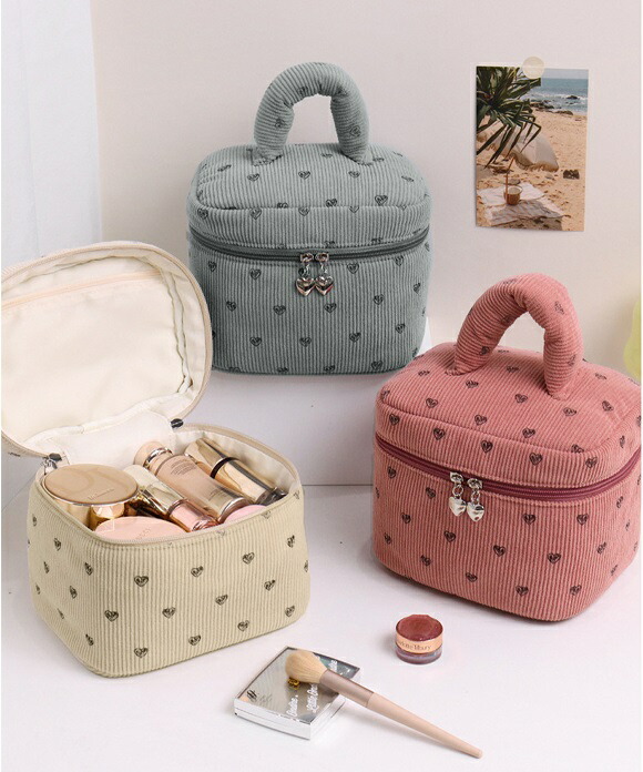ポーチ コーデュロイ ハート柄 バニティポーチ メイクポーチ コスメポーチ 大容量 小物入れ 収納 持ち運び かわいい 韓国ファッション レディース トラベルポーチ クラシカル レトロ ガ カジュアル