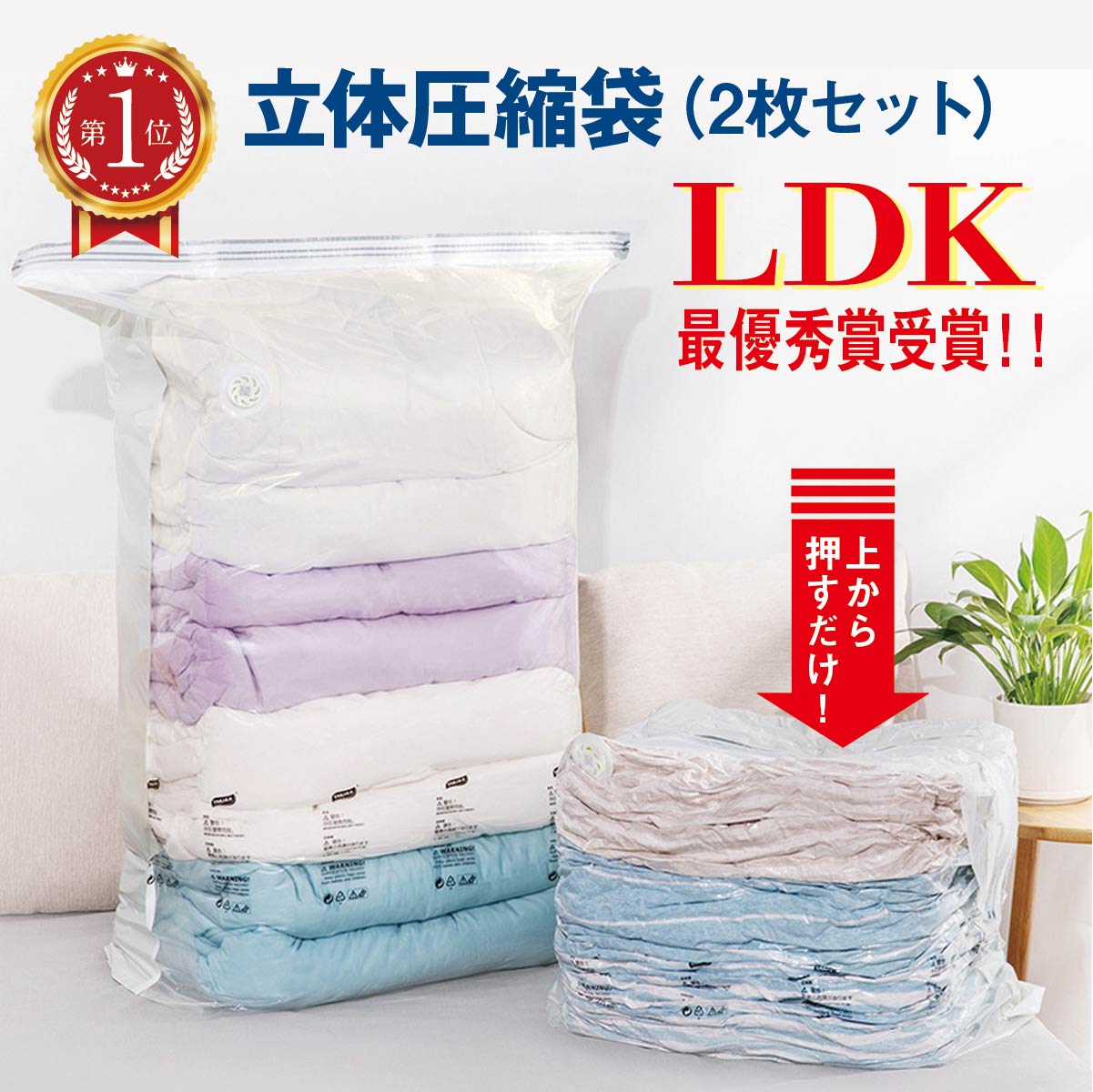 \ 雑誌に掲載されました! / \ お得な2枚入り / 掃除機不要!手で押すだけ簡単圧縮袋 かさばりがちな衣類をスッキリ収納できる便利グッズです♪